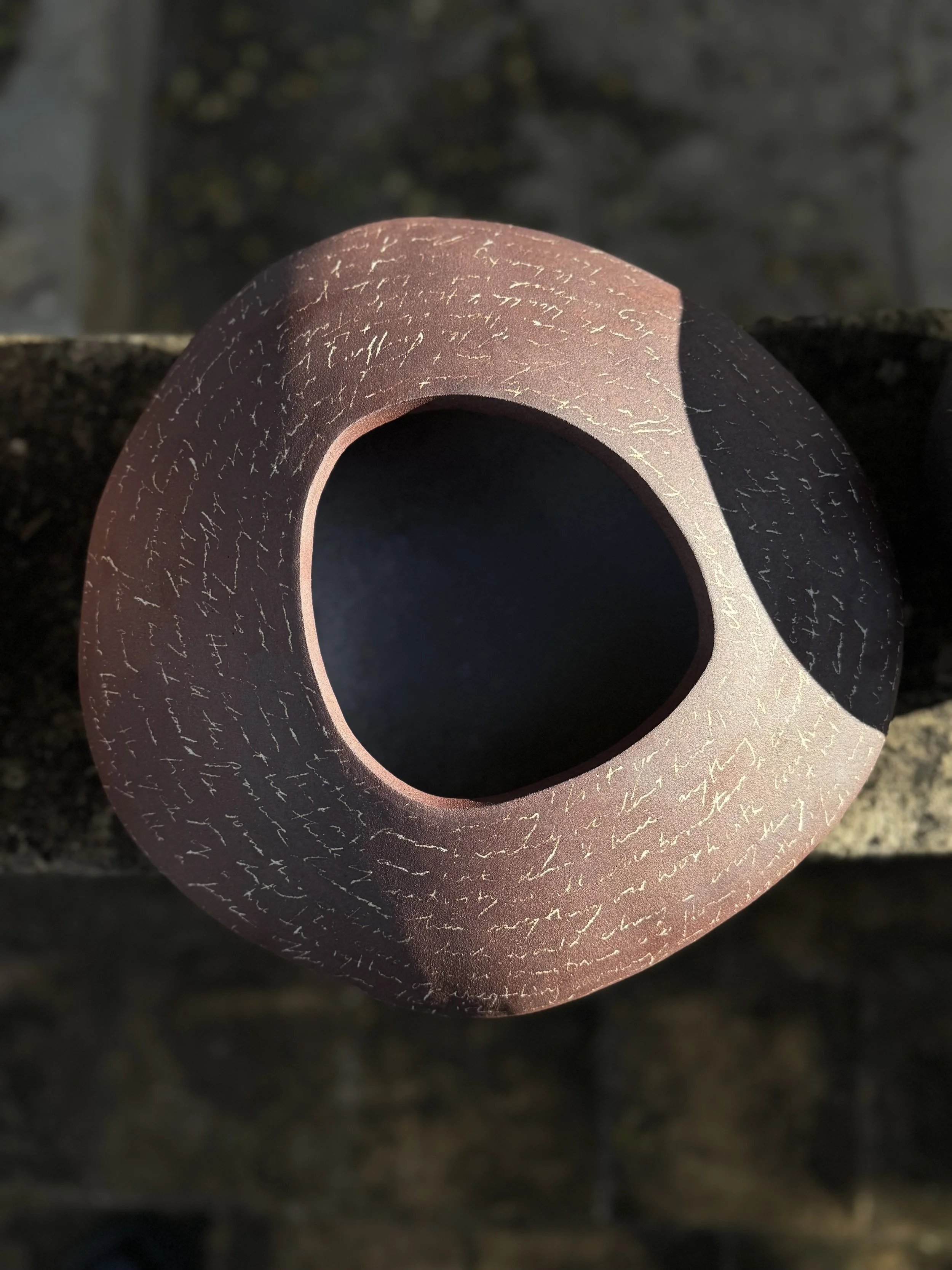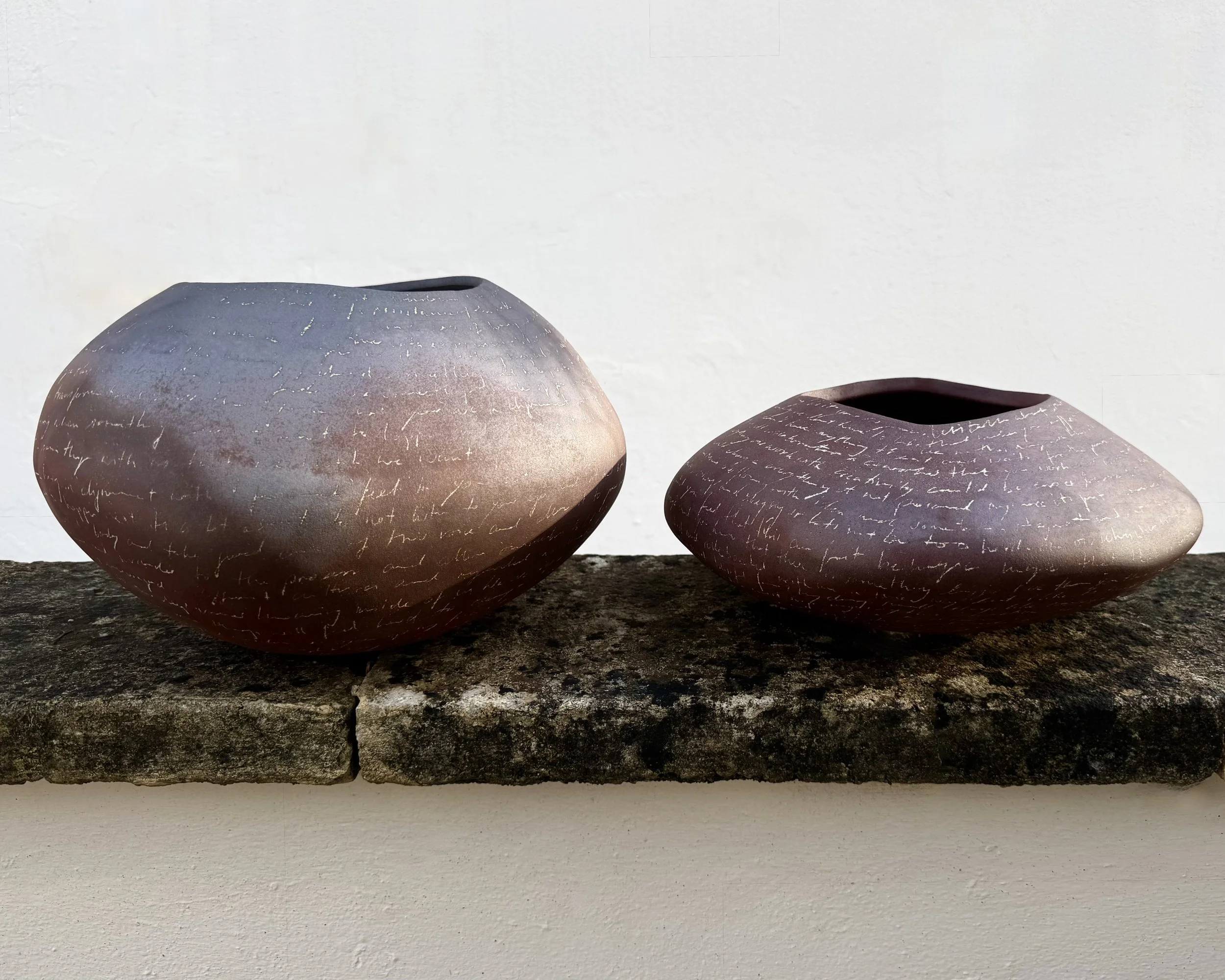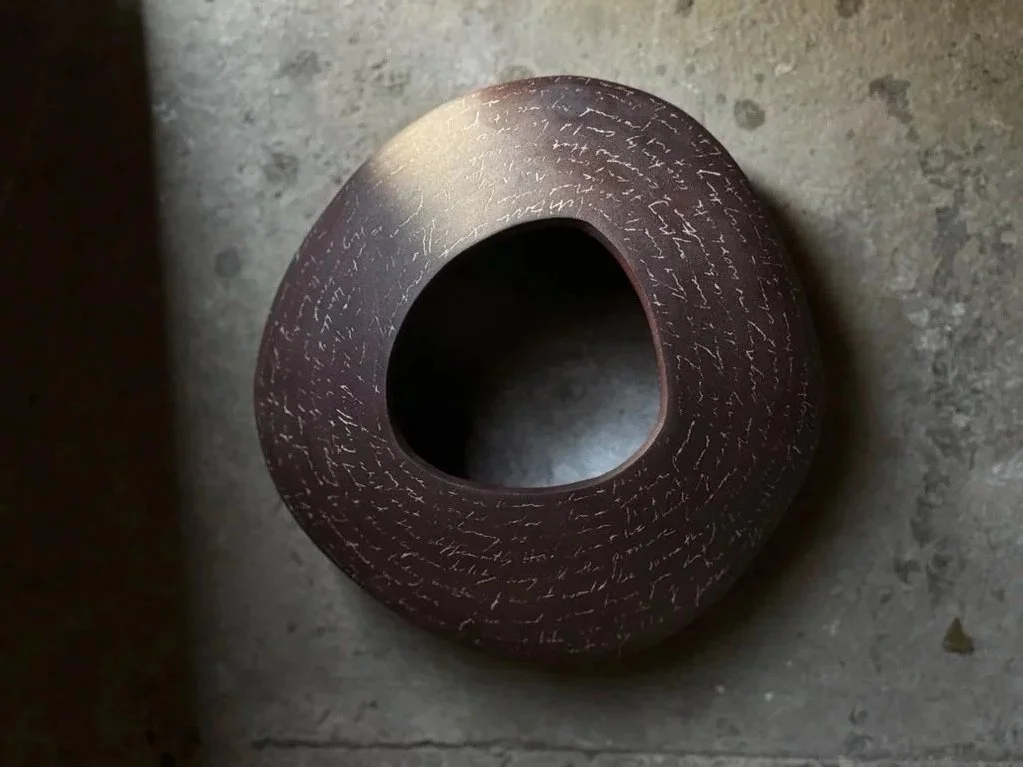 These works are created through an intuitive process that combines earth, water, and air, with each piece refined until it reaches completion before being fired. The making itself becomes a meditative practice—one of presence and acceptance that moves through, rather than around, the complexities of human experience.